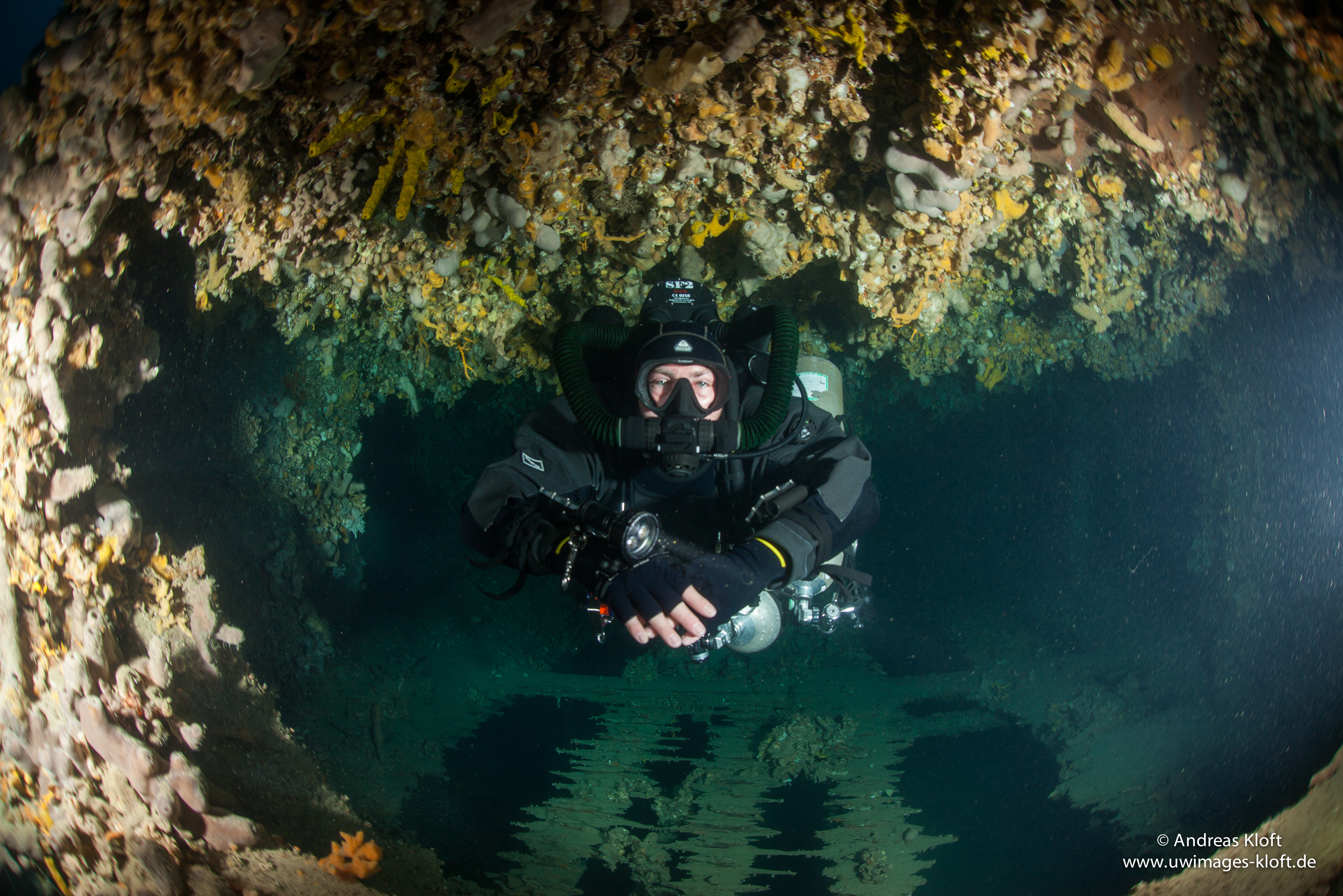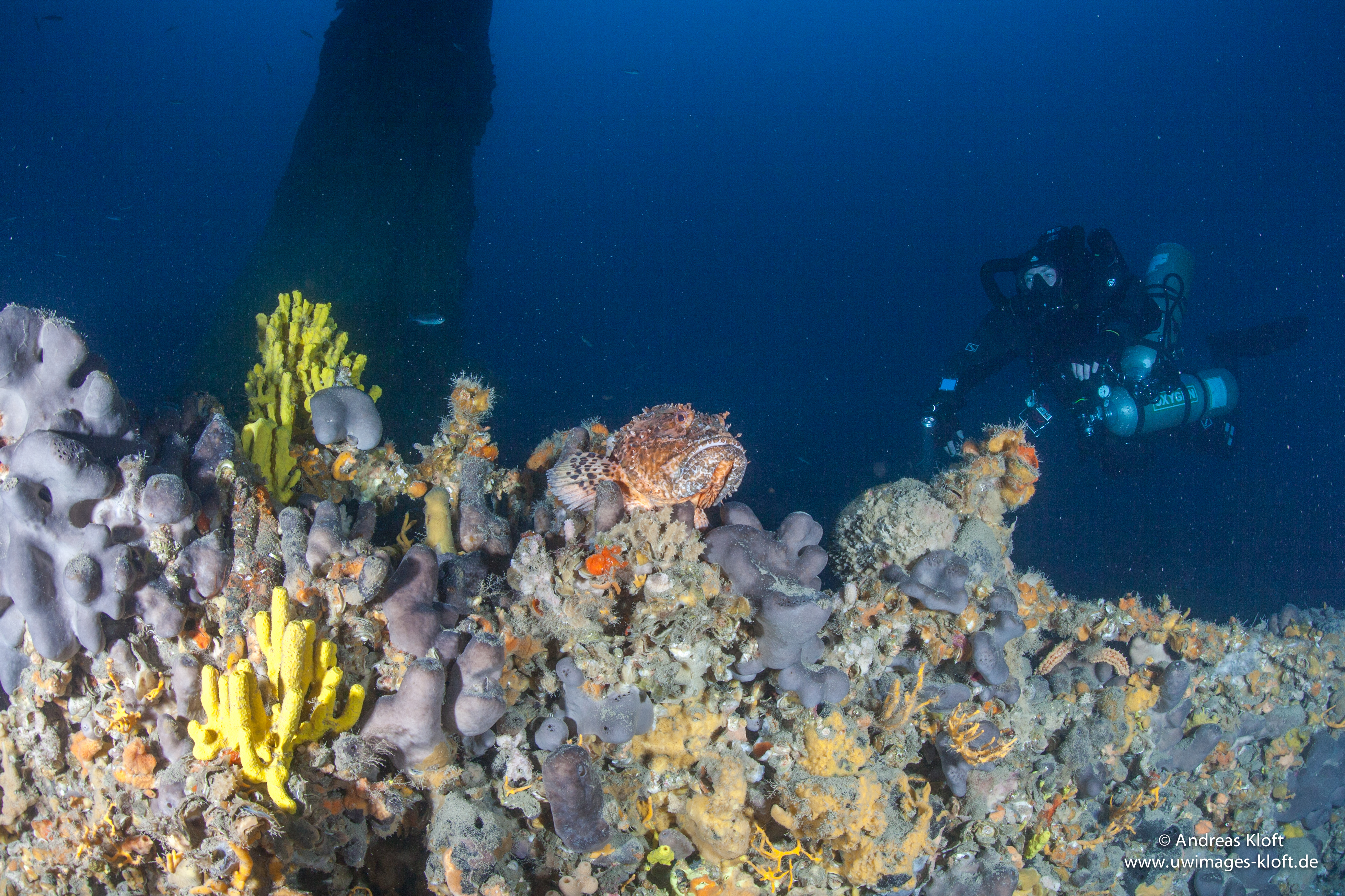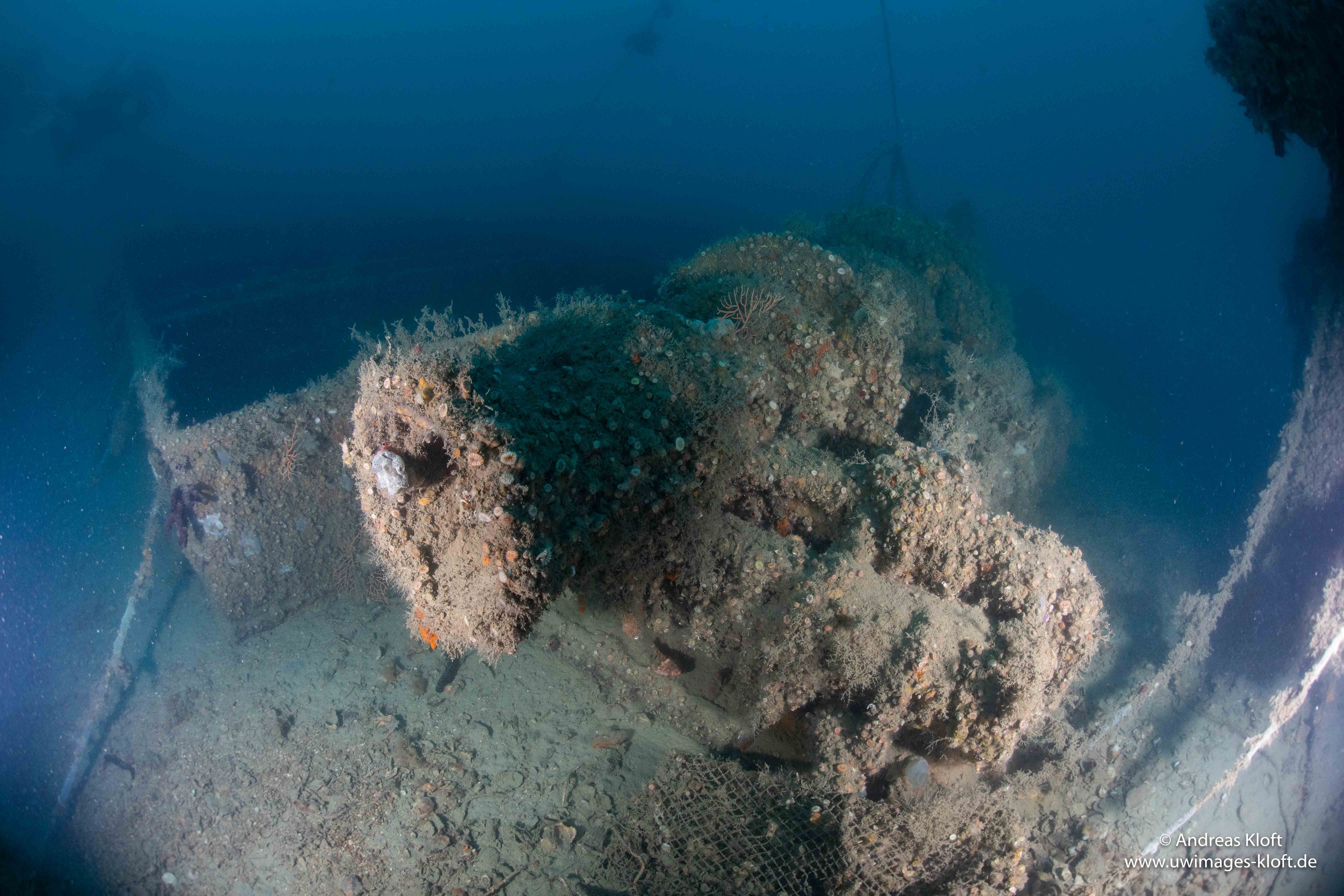 Das Wrack selbst ist über und über bewachsen und mit Schwämmen bedeckt, es tummeln sich Meeraale, große Drachenköpfe und so mancher Hummer versteckt sich im Alteisen.
