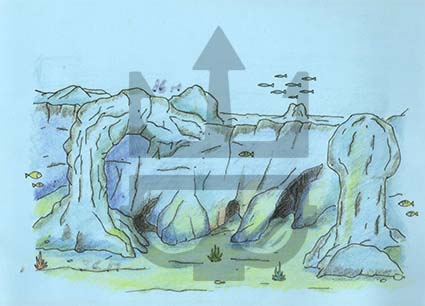 Dieser Felsen befindet sich in einer Tiefe von etwa 26m und steht unmittelbar an einer Kante die bis in eine Tiefe von 36m abfällt. Der Felskante entlang tauchend gelangt man zu einem wunderschönen bewachsenen Durchbruch. Dieser windet sich im 90° Winkel durch den Felsen und man kommt direkt an einer Wand heraus.