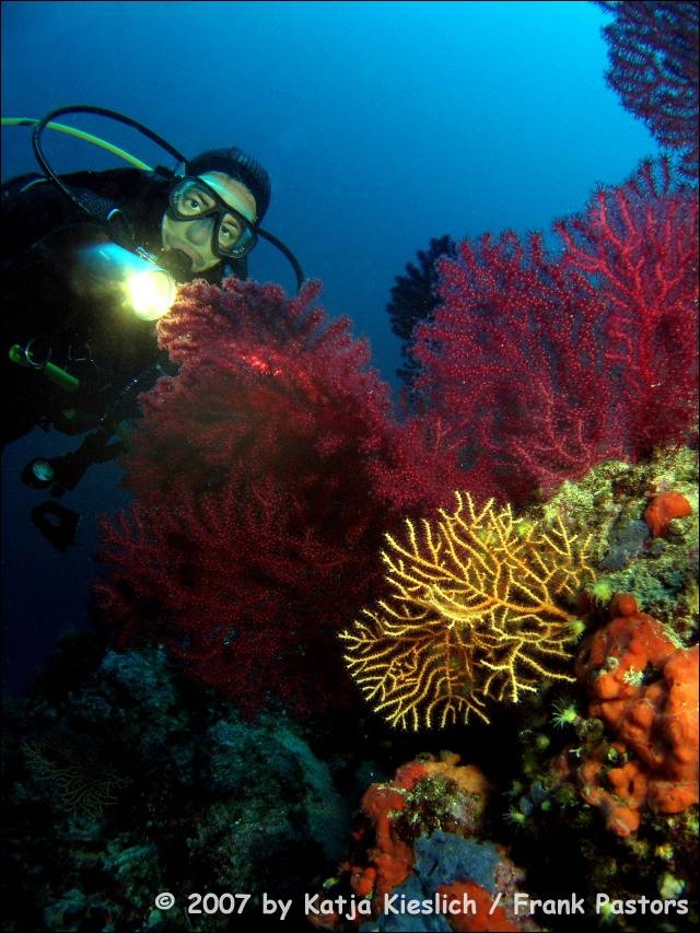 Taucht man weiter kommt in ca. 25 m ein zweiter tieferer Einschnitt, ebenso schön aber etwas größer. Etwas weiter an der Wand in ca. 30 m Tiefe sind hier auch Fächer von roten Gorgonien.