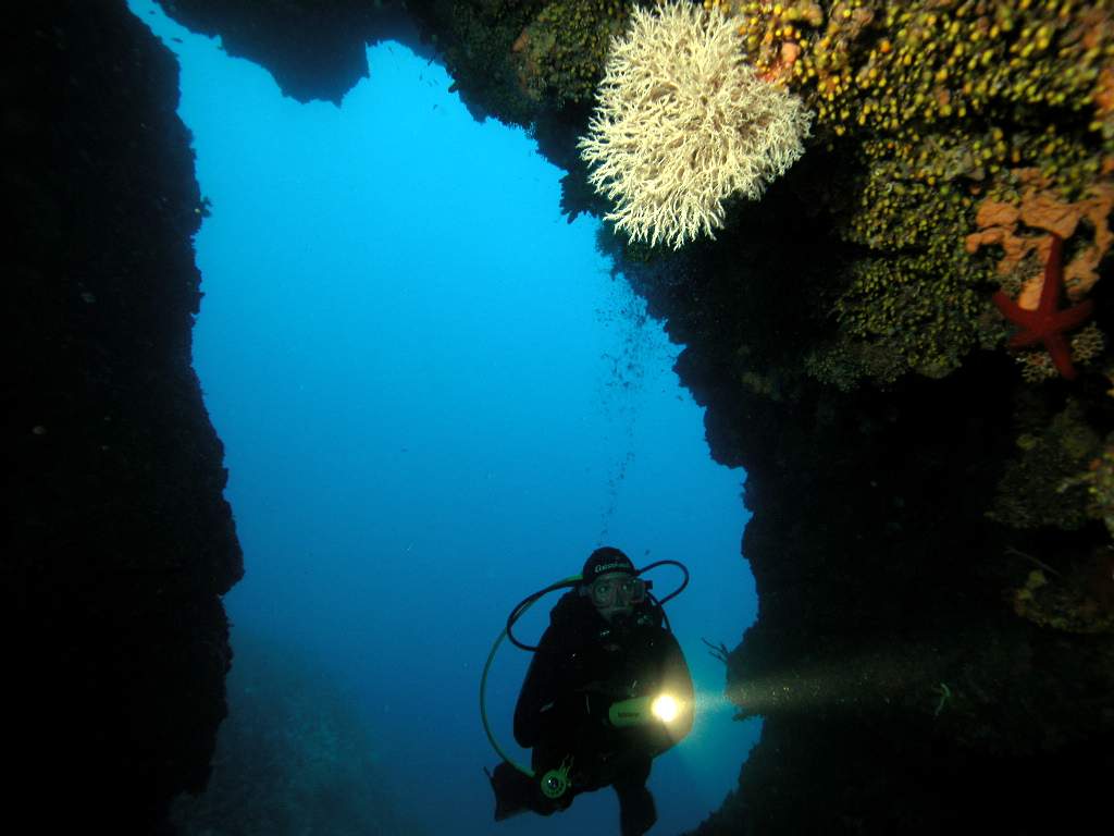 Zum einen hat man die Möglichkeit direkt an der Insel abzutauchen. Mit der rechten Schulter entlang der Insel Richtung Osten kommt auf ca. 20 m Tiefe ein Einschnitt (ca. 10 m hoch und 3 m breit). Es lohnt sich hineinzuschauen oder hinein zu tauchen. Hier kann man Hart- und Weichkorallen in allen Farben sowie Langusten sehen.