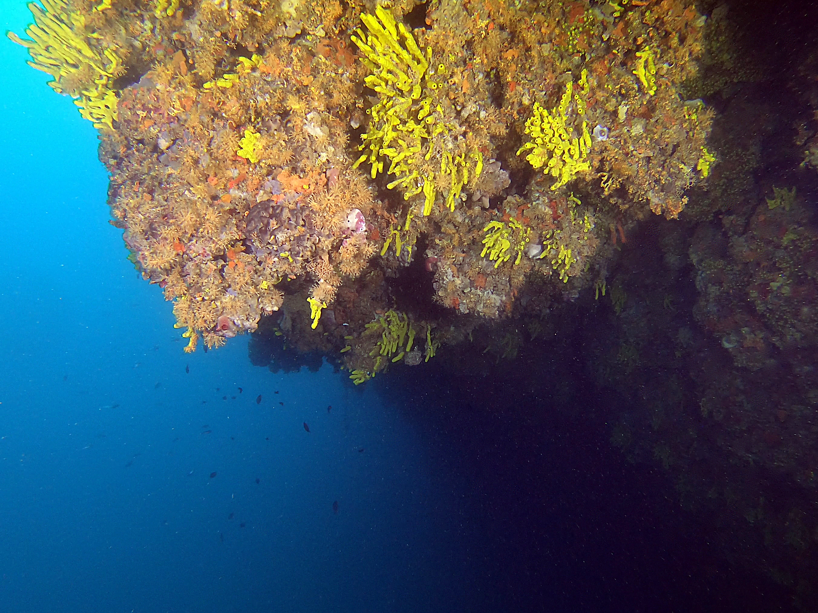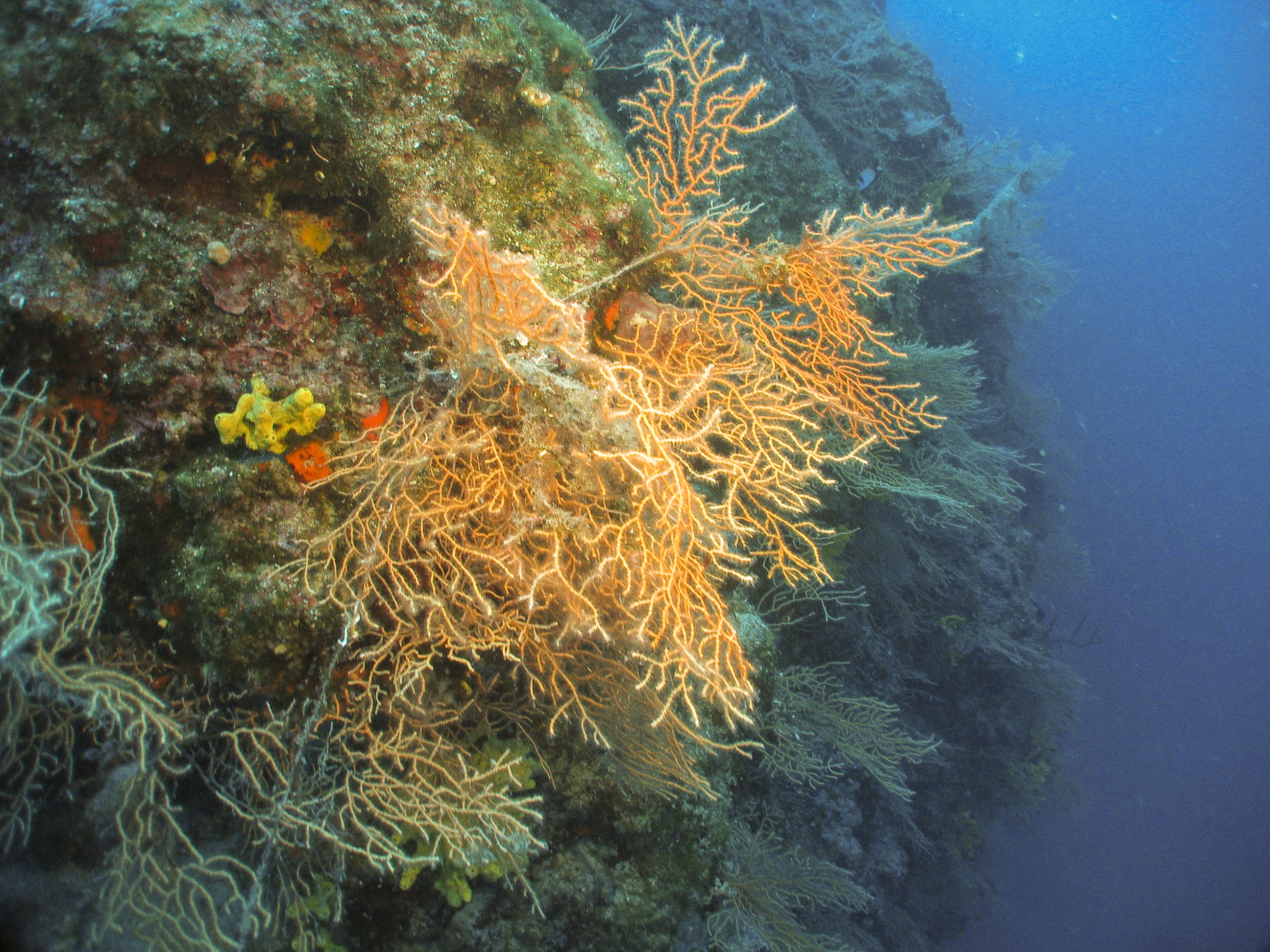Nach einem weiteren Flachstück erfolgt der zweite Abbruch bei ca. 25-30m. Die Steilwand ist dicht mit gelben Fächerkorallen bewachsen.