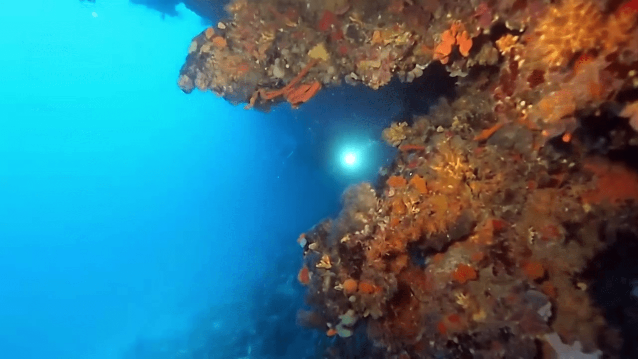 Die Spitze eines Felsens setzt sich unter Wasser in einer atemberaubenden Steilwand und einer riesigen Grotte fort.