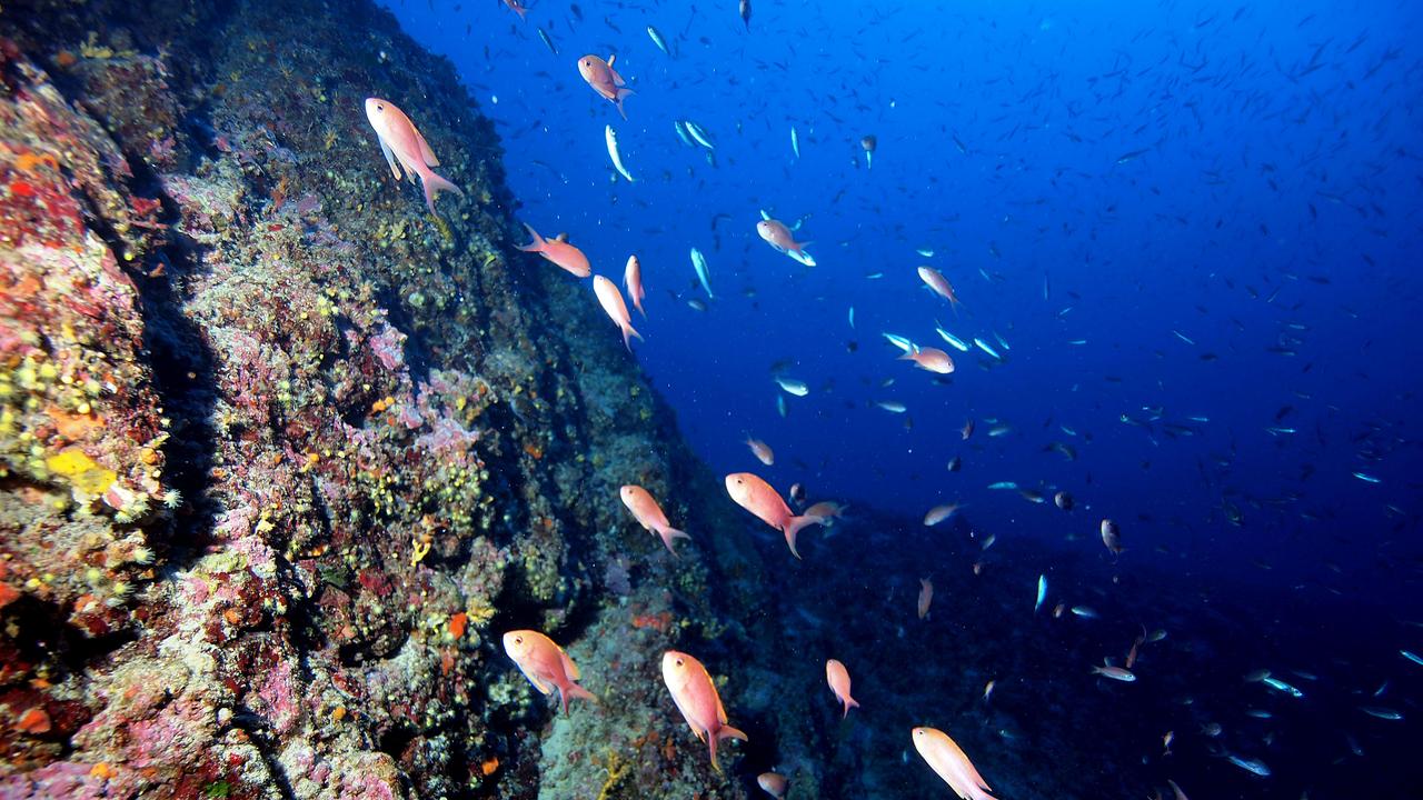 Bis in die Tiefe von über 80 Meter erstreckten sich unzählige Nischen, Spalten und Überhänge. Die Steilwand ist mit Korallen sowie roten und gelben Gorgonien bedeckt. Langusten, violette Fadenschnecken und Schwärme von Mönchsfischen begegnen uns beim Tauchgang. Selbst Thunfische suchen in der strömungsreichen Umgebung nach Nahrung.