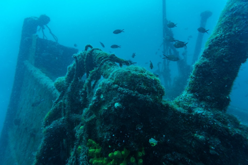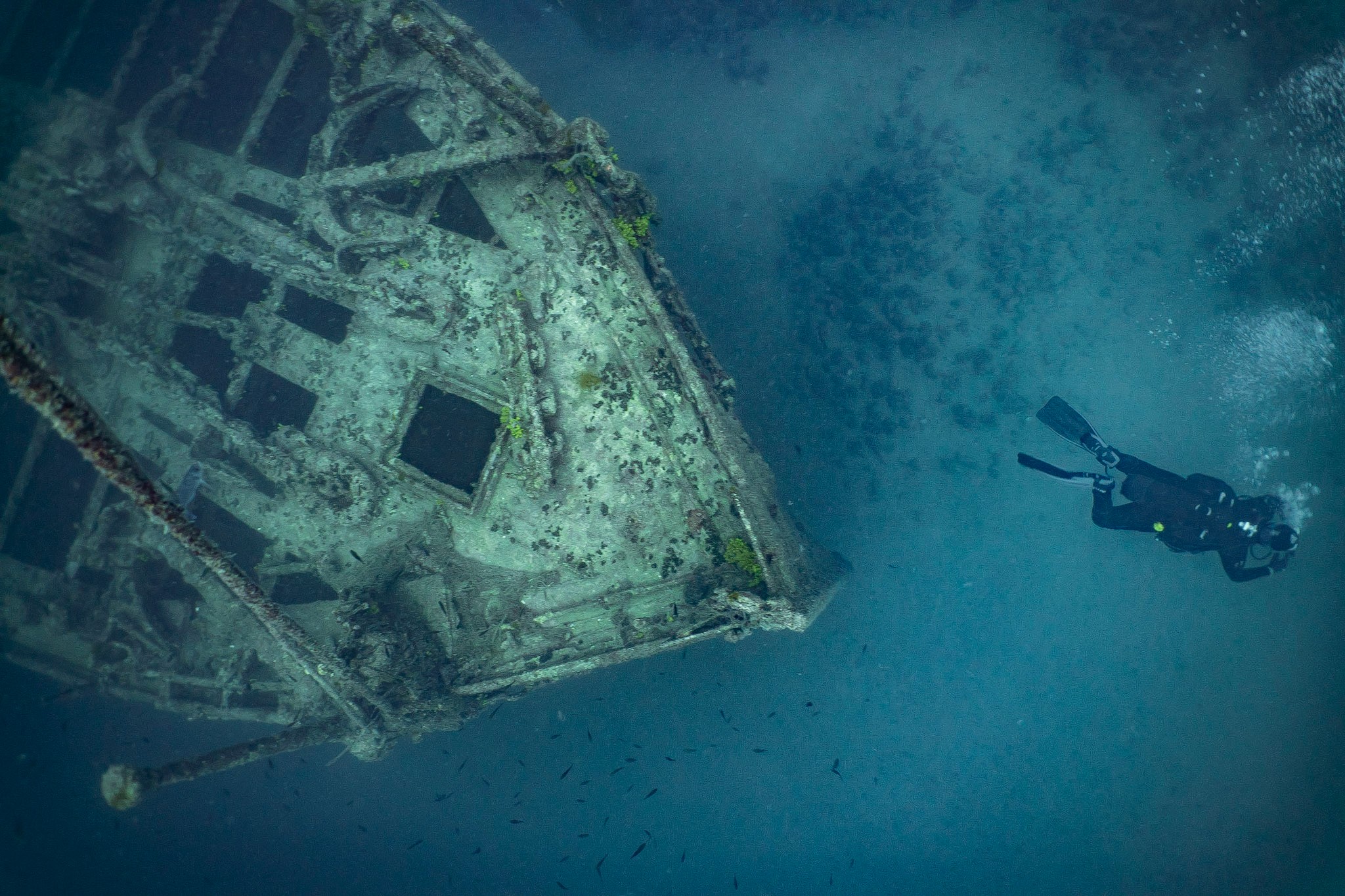 Langsam und vorsichtig, nur kein Sediment aufwirbelnd, schweben wir in Richtung zum ersten Deck. Das nach oben offene Oberdeck wird nur mehr durch Steher und Querbalken gestützt. Der stabil aufragende und von Fischschwärmen belagerte Mast ist von hängengebliebenen Fischernetzen dicht umgeben.
