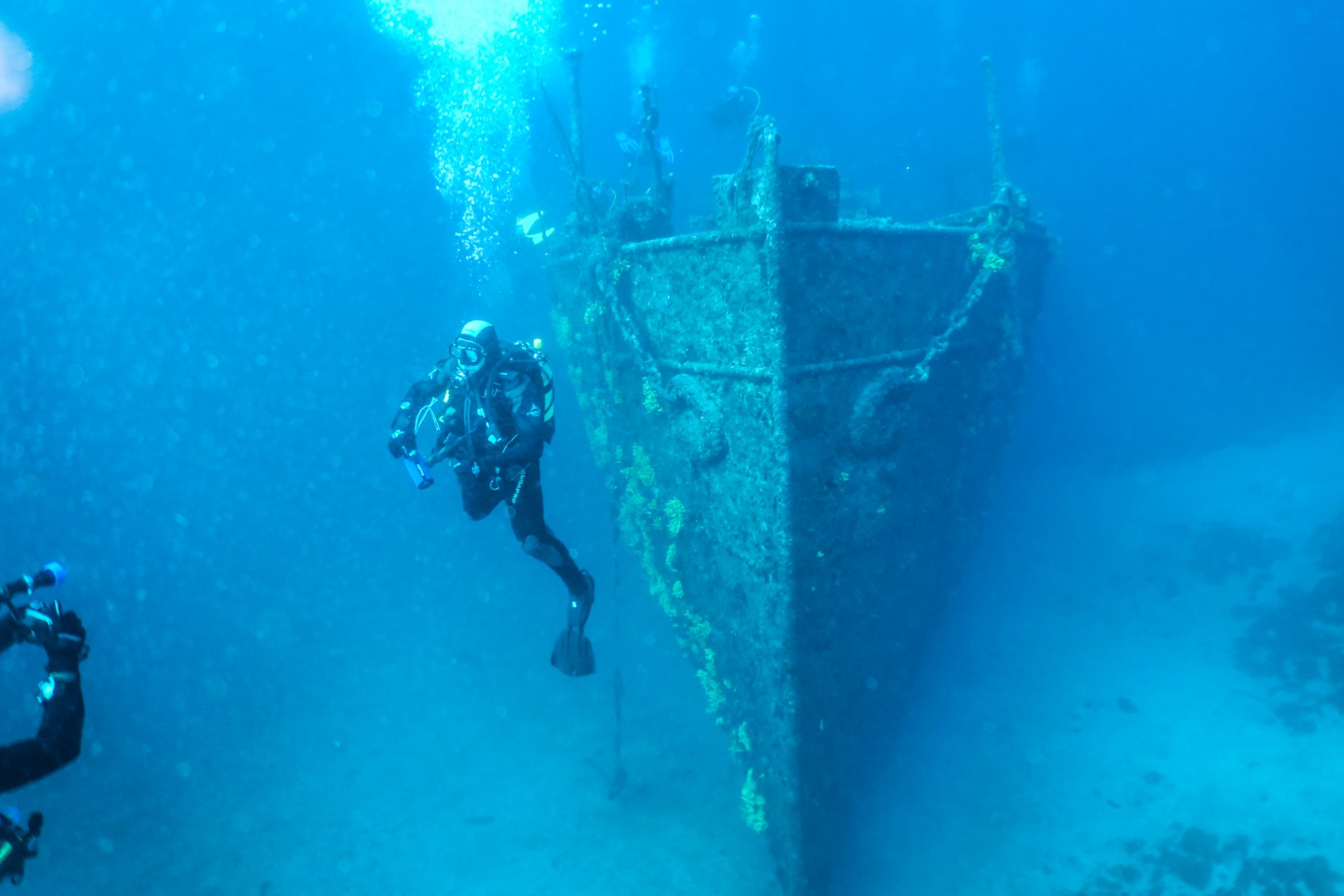Das Wrack baut sich plötzlich wie eine Wand aus Stahl vor einem auf. Im ersten Moment musste ich unmittelbar an die Titanic denken. So oder so ähnlich muss es Robert Ballard, Entdecker der Titanic ergangen sein, als er den riesigen Stahlrumpf erstmals im Schein der Scheinwerfer seines U-Bootes erblickte.