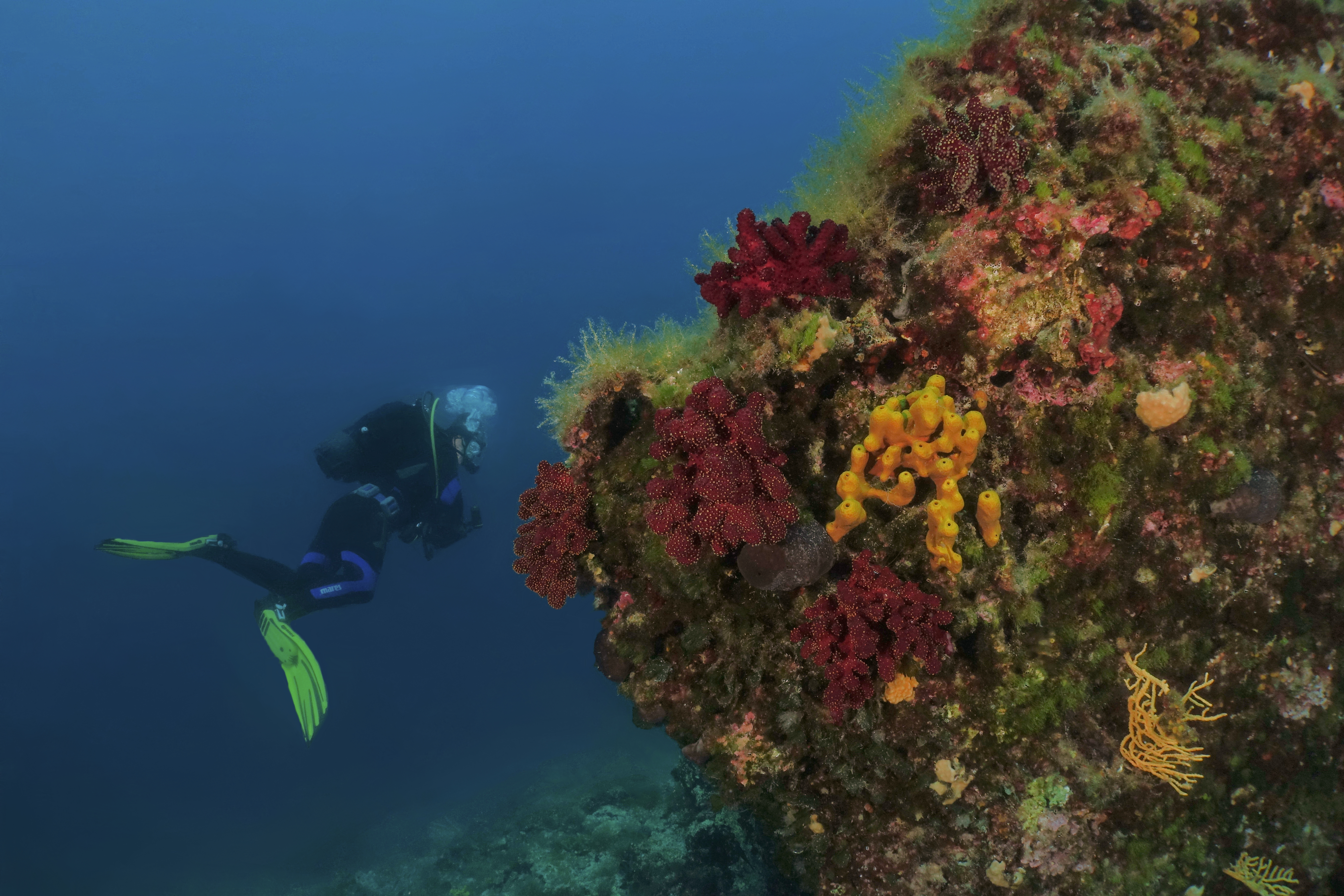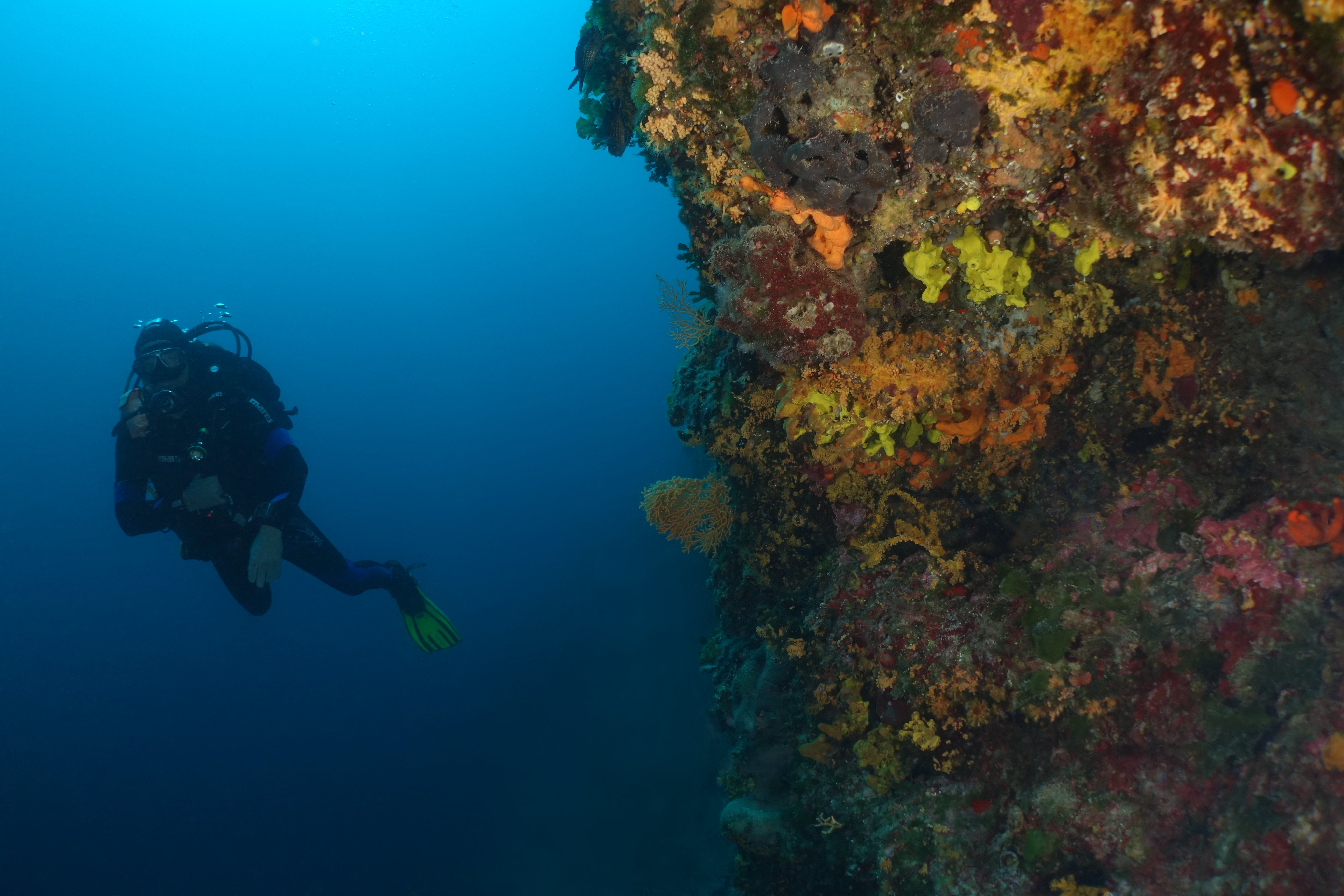 Richtung Norden haltend findest Du wunderschön bewachsene Steilwände mit enormen Fischreichtum. Im Süden fällt die Steilwand senkrecht und überhängend bis auf 40 Meter Tiefe ab. Die Steilwände sind mit gelben und violetten Gorgonien bedeckt.