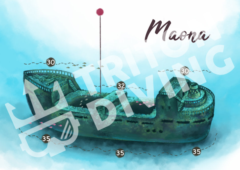 Das Wrack "MAONA" liegt etwa 1,8 Nm südlich von Sv. Ivan na Puccini, ist ein selten betauchtes Wrack obwohl jeden einzelnen Tauchgang wert. Dieses 1942 vermutlich durch eine Mine gesunkene Wrack, ist mit seiner Größe von 45x8m eher klein.