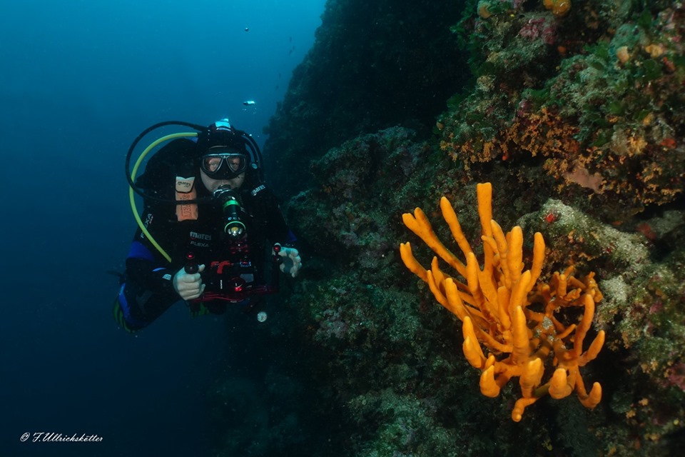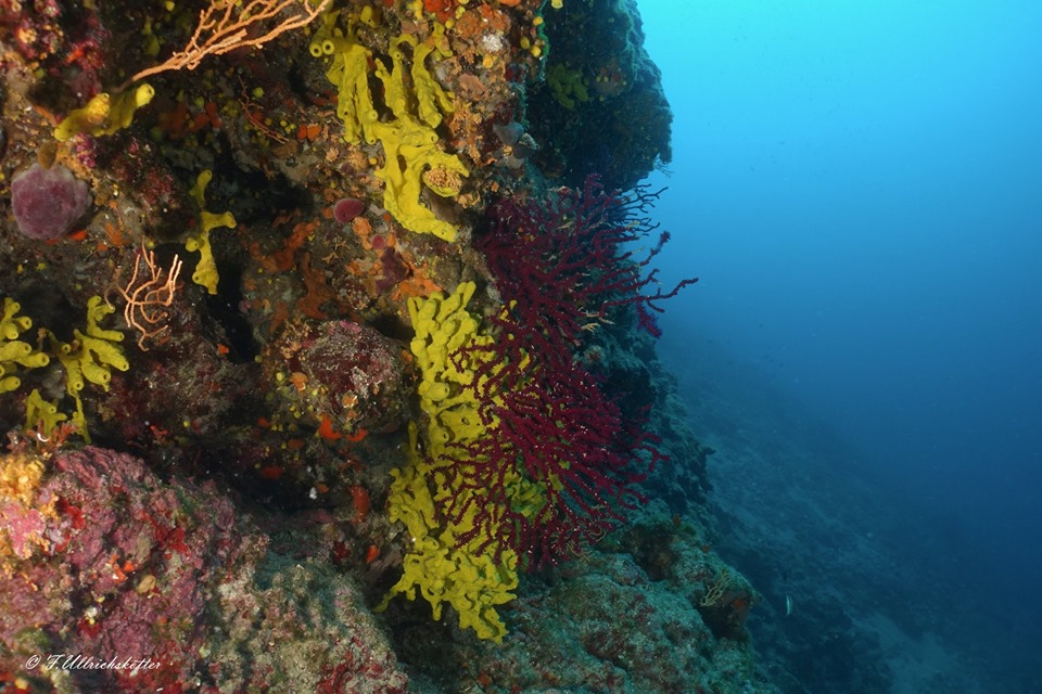 Die erfahrenen Taucher gehen jetzt weiter nach rechts auf eine der schönsten Steilwände in der gesamten Umgebung welche außen bis auf ca. 45 m abfällt. Diese ist ebenfalls sehr schön mit bunten Schwämmen und lila Gorgonien bewachsen., auch hier gibt es immer wieder Drachenköpfe und viele Kleintiere zu sehen.
