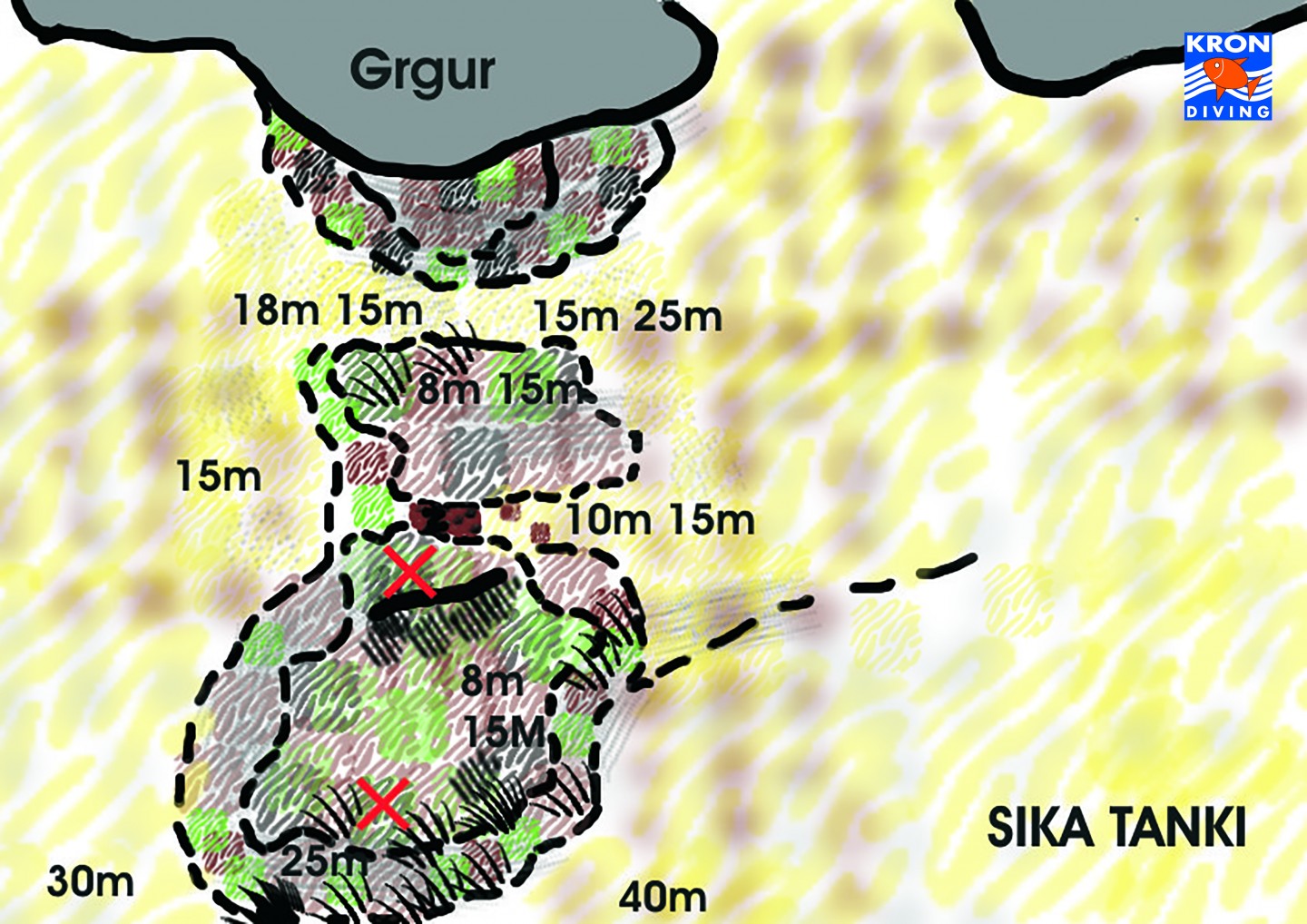 Der Tauchplatz "Sika Tanki" befindet sich mittig an der Nordost gelegenen Seite auf Sveti Grgur. Dieser Tauchplatz ist bekannt für die Strömung und seine farbenfrohe Wand.