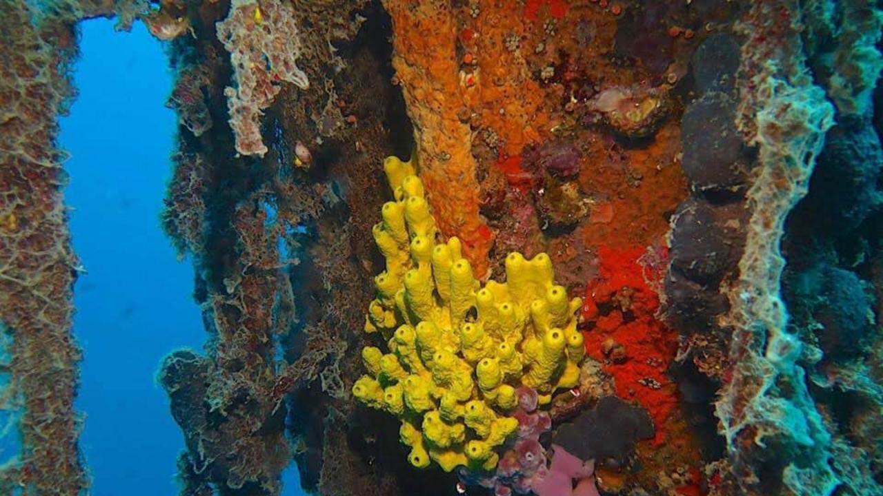 Im Schein der Taucherlampe erstrahlt das Wrack in allen Farben der Unterwasserwelt. Fischschwärme begleiten den Tauchgang.